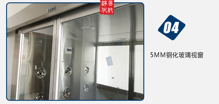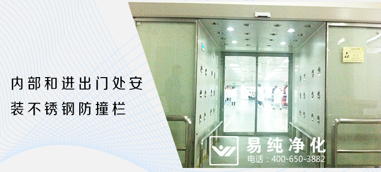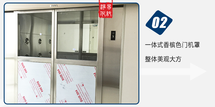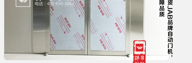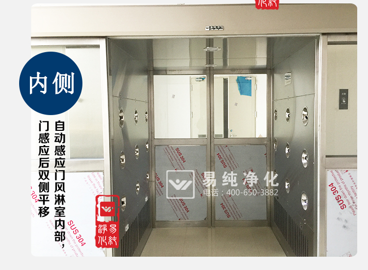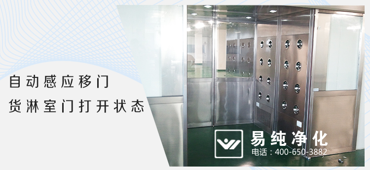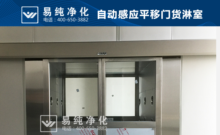 自動感應門貨淋室,由雙樘自動感應門和風淋室箱體組成,雙門為自動感應型開啟和自動關閉,雙門在吹淋過程中聯鎖,無法同時打開,將進入車間物流表面的灰塵和浮埃吹落。